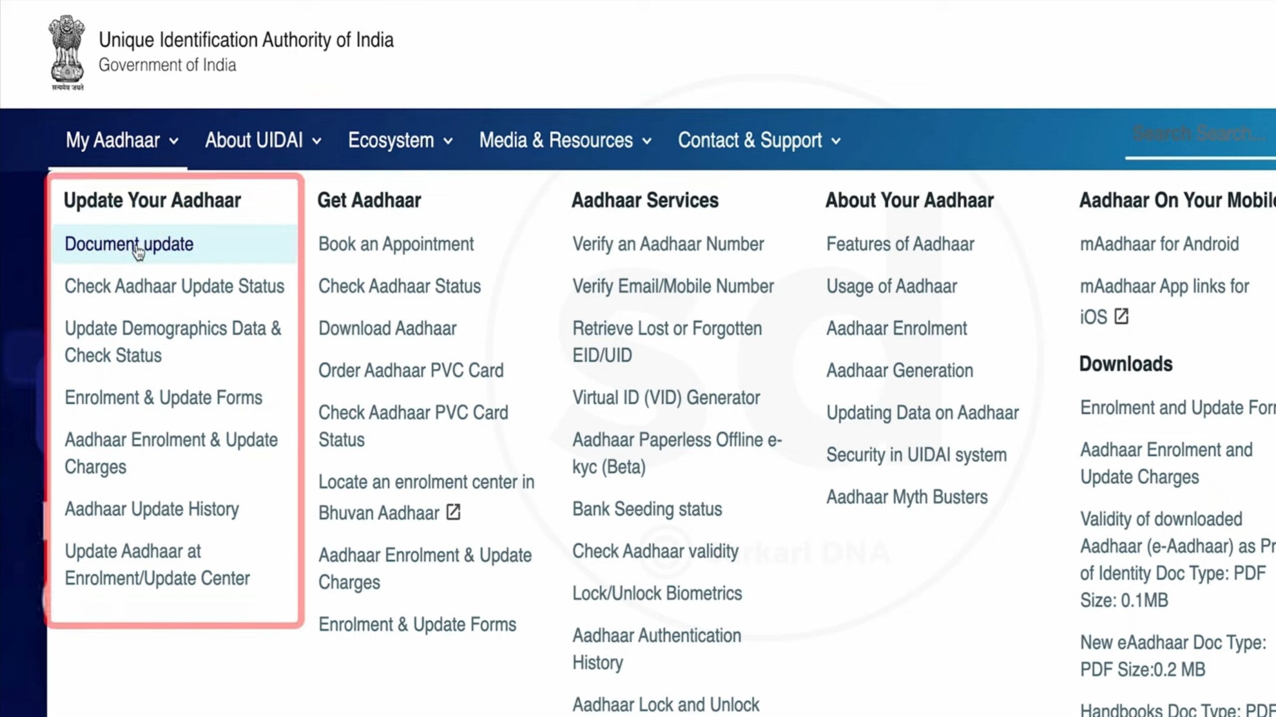 क्लिक करोगे तो आप सेम वेबसाइट पर आ जाओगे। यह मैं अपने आधार कार्ड से दुख में अपडेट करने के लिए सबसे पहले तो आप सभी को मीनू के सेक्शन में आना है। जहां पर आप सभी को अपडेट योर आधार के सेक्शन में पहला ही ऑप्शन मिल जाता है। डॉक्यूमेंट अपडेट का तो हमें इसी ऑप्शन का। इलेक्शन करेंगे और इसके बाद में आप सभी को यहां पर देखोगे कि सिम डेट यहां पर भी दिखाए गए किस डेट तक आप अपने आधार से अपने डॉक्यूमेंट फ्री आफ कॉस्ट अपडेट कर सकते हो। आप कोई भी चार्ज देने की जरूरत नहीं होगी।
